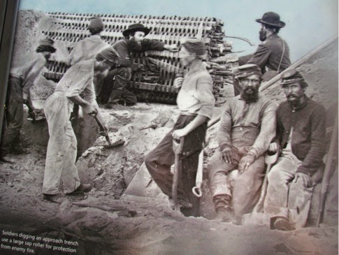 Civil War soldiers met in a 1917 reunion and, since so many of them were alive, they could pinpoint just where they were and thus the battlefield is an extremely accurate portrayal of all positions. Artillery pieces are where they were located, redoubts and fortifications, though eroded by weather are where they were and trenches dug by the Union are still evident. Here are some Union soldiers digging an approach. Note the wooden roll which protected them as they dug.