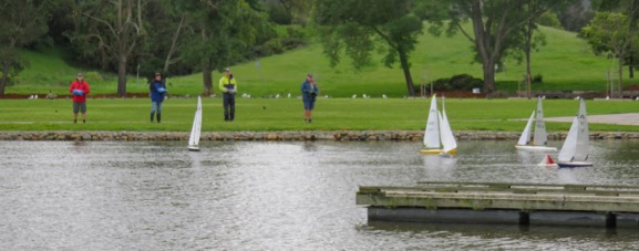 guys with their remote controlled sailboats in a regatta around some bouys they had put out,