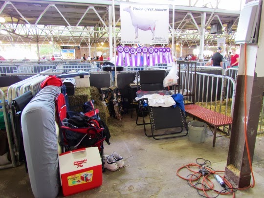 It’s about families and getting together. Here’s a family section of the sheep barn. Look at all those ribbons! And, trust me, these families live at the fair. Look at the chairs, the mattress, the cooler, the shoes. They’re here for the duration.